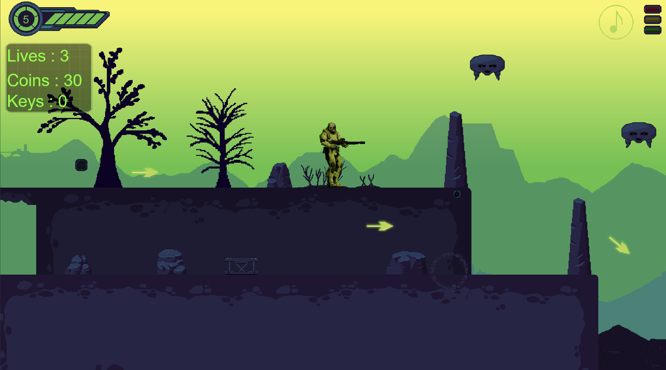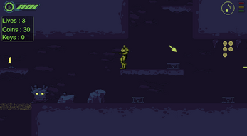 Sci-Fi platformer game, on an alien planet. Collect upgrades and find your way through. The more coins you collect, the better the ending.
